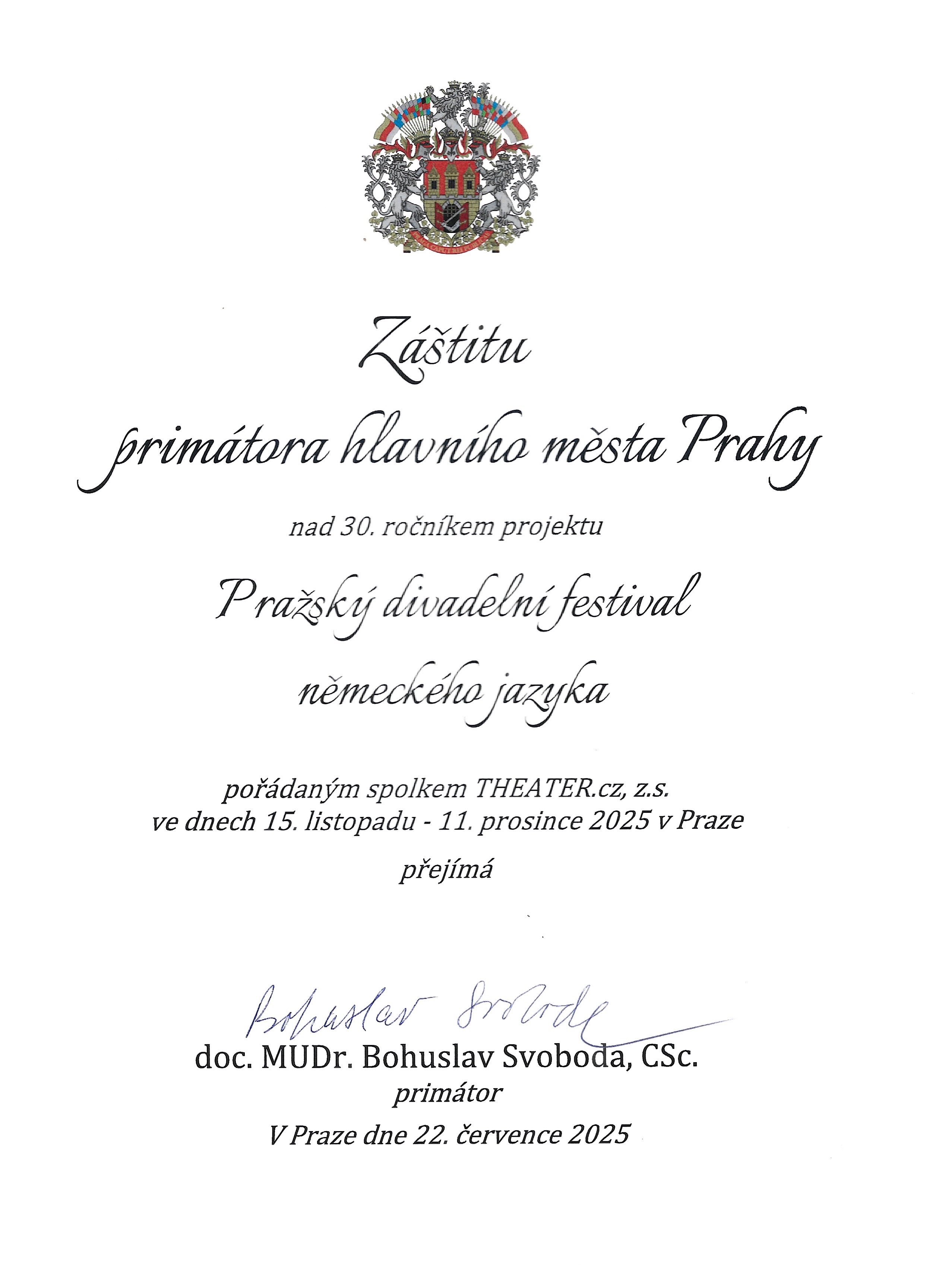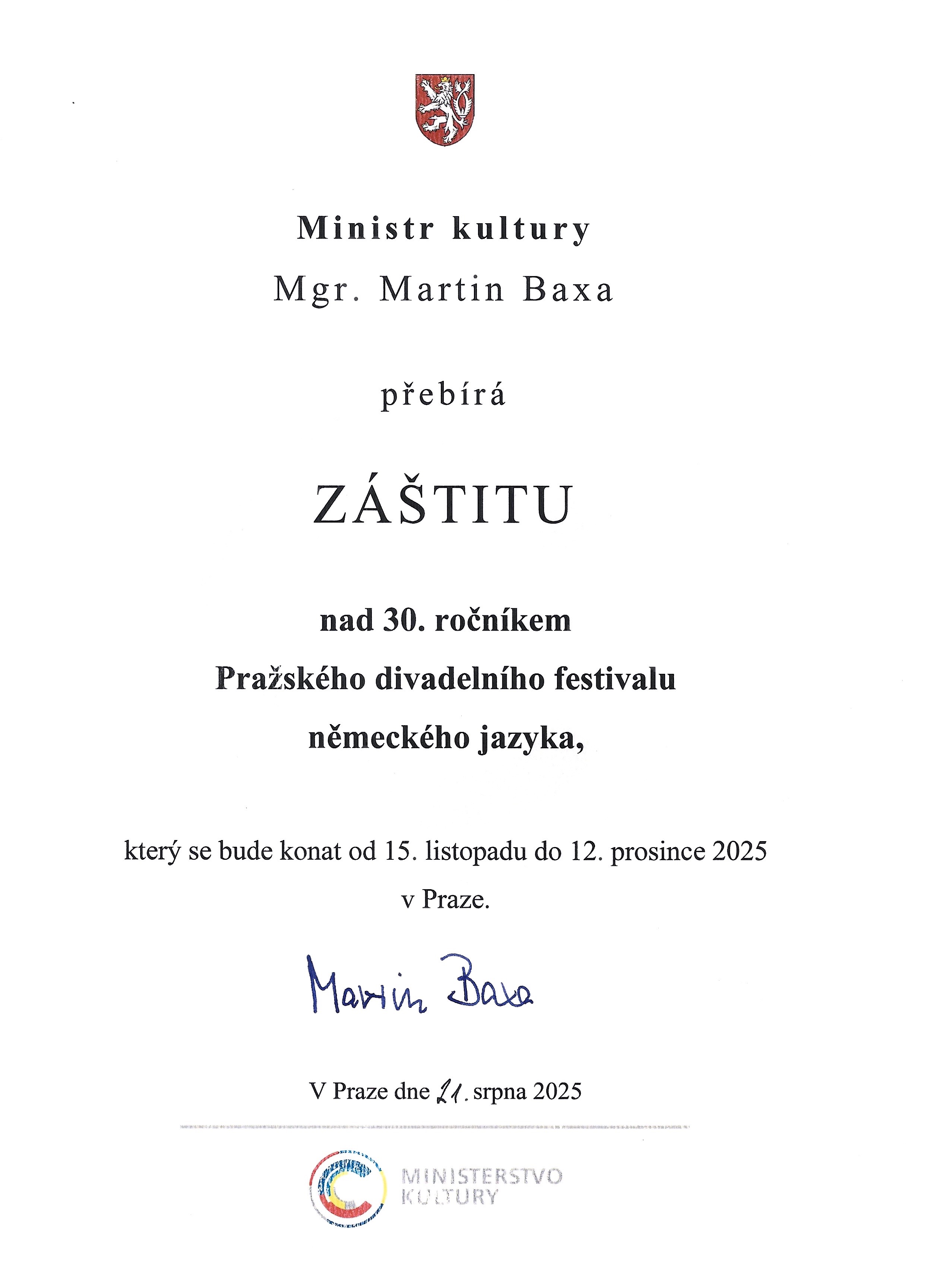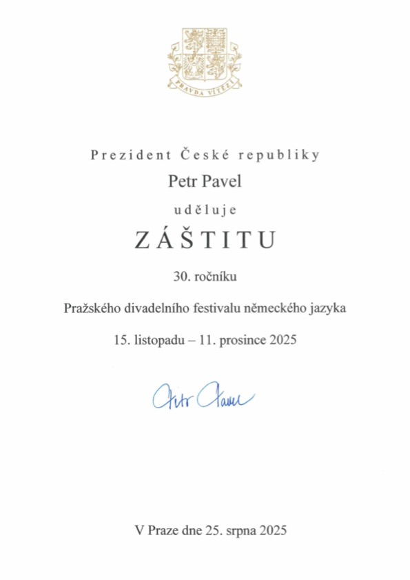 30. ročník Pražského divadelního festivalu německého jazyka se koná pod záštitou prezidenta České republiky pana Petra Pavla, ministra kultury pana Mgr. Martina Baxy a primátora hl. m. Prahy pana doc. MUDr. Bohuslava Svobody, CSc. Děkujeme!